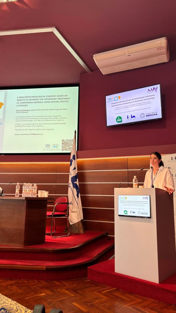 Queremos felicitar a nuestra becaria doctoral UBA Maria Sol Rodriguez por presentar sus avances de investigación en el Simposio Latinoamericano de Inmunología Veterinaria. El evento científico tuvo lugar en INIA, La Estanzuela, Colonia, Uruguay del 18 al 21 de noviembre. Allí, Maria Sol realizó una presentación oral titulada "Una nueva estrategia biotecnológica basada en insectos para optimizar el tratamiento veterinario de animales de compañía mediante citoquinas especie-específicas". Fue gratificante compartir los avances de investigación obtenidos en NANOBIOTEC con colegas y profesionales del área veterinaria para seguir trabajando y generando nuevos vínculos que nos permitan continuar investigando!