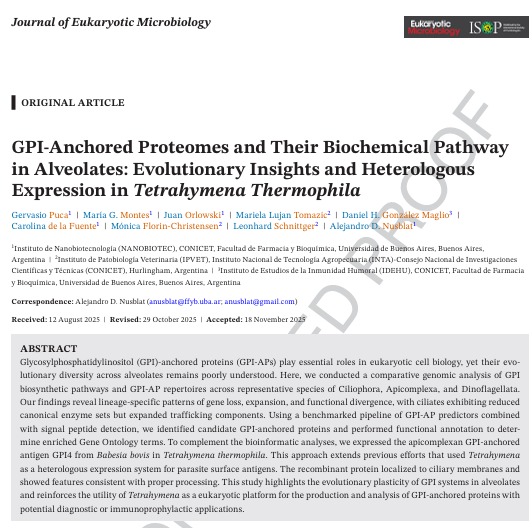 Las proteínas ancladas a glicosilfosfatidilinositol (GPI-APs) cumplen funciones esenciales en la biología celular eucariota, pero su diversidad evolutiva en alveolados aún es poco comprendida. Este estudio presenta un análisis genómico comparativo de las vías de biosíntesis de GPI y los repertorios de proteínas GPI-ancladas en especies representativas de Ciliophora, Apicomplexa y Dinoflagelados.