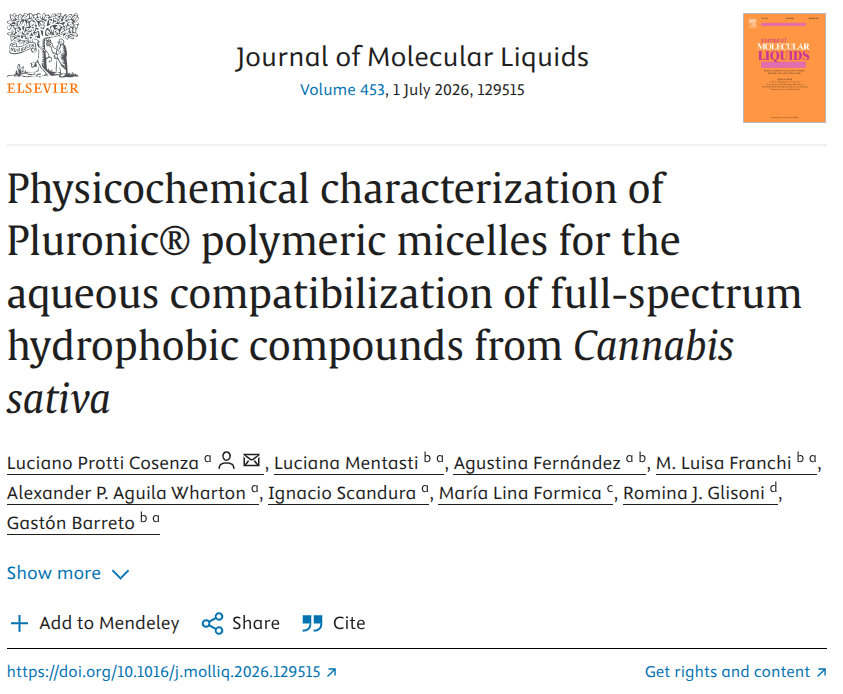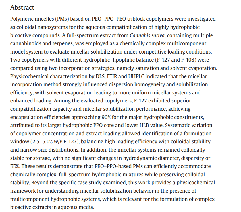 “Physicochemical characterization of Pluronic® polymeric micelles for the aqueous compatibilization of full-spectrum hydrophobic compounds from Cannabis sativa, mostramos cómo micelas poliméricas PEO–PPO pueden organizar y estabilizar mezclas altamente hidrofóbicas y complejas (cannabinoides + terpenos) en medio acuoso